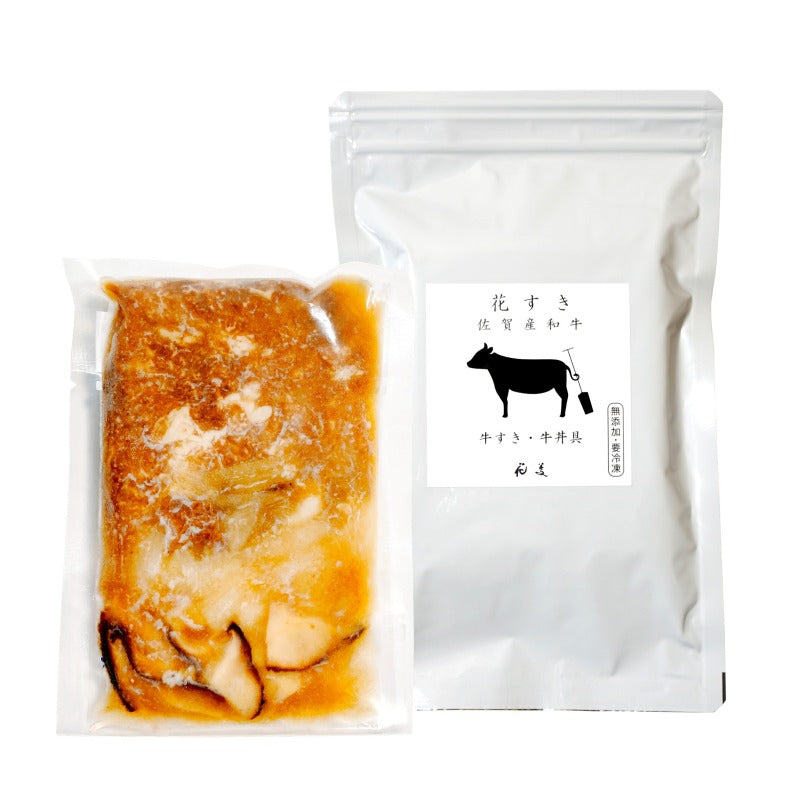 ミシュランガイド福岡・佐賀・長崎 2019 特別版掲載店の「花菱」が作る「すき焼き・牛丼具」。大手通販サイトの楽天市場では、すき焼き部門週間売上1位を獲得した商品がこの「花すき」です。すき焼きとしても牛丼の具としても召し上がれる便利で美味な一品です。濃厚な旨味と柔らかな肉質を兼ね備えたブランド牛である佐賀産和牛を使い、甘味が強い佐賀県産玉ねぎで自然の甘味、しいたけの和の旨味、ごぼうの香りが合わさり、「旨味・香り・食感」を楽しめます。また、えそだし・北海道産の利尻昆布だしによるクセがなくあっさりとしながらも深く芳醇な風味で後味もすっきり。無添加調味料だけで食材の自然なコクと甘味を引き出し、肉と野菜のバランスよく、安心して毎日食べても飽きない味付けになっています。